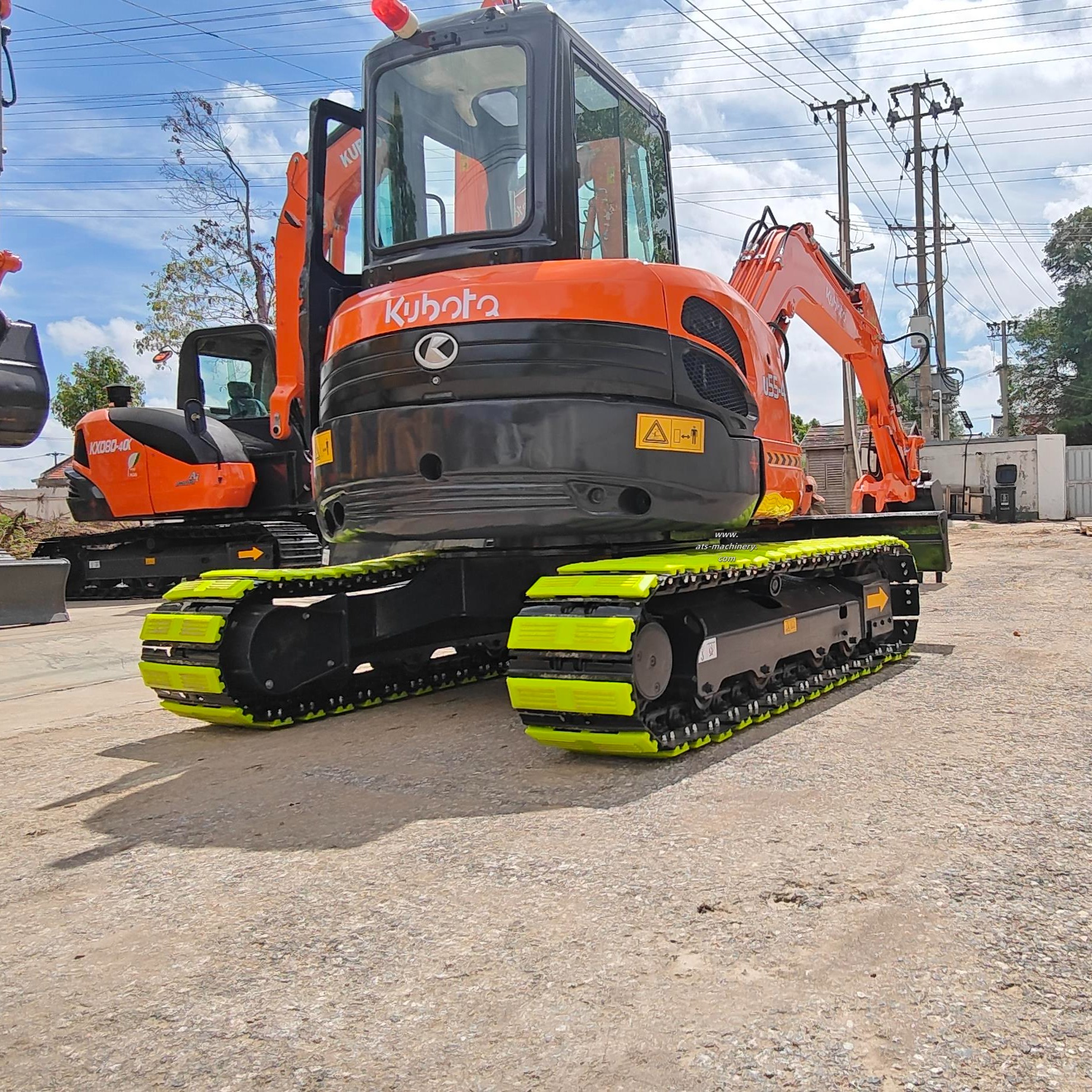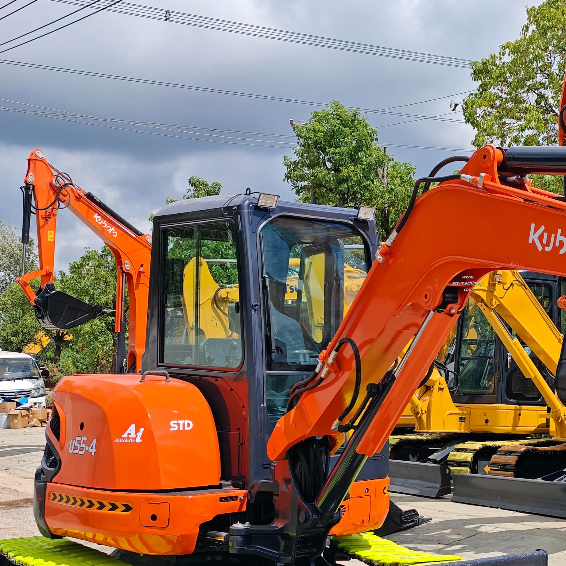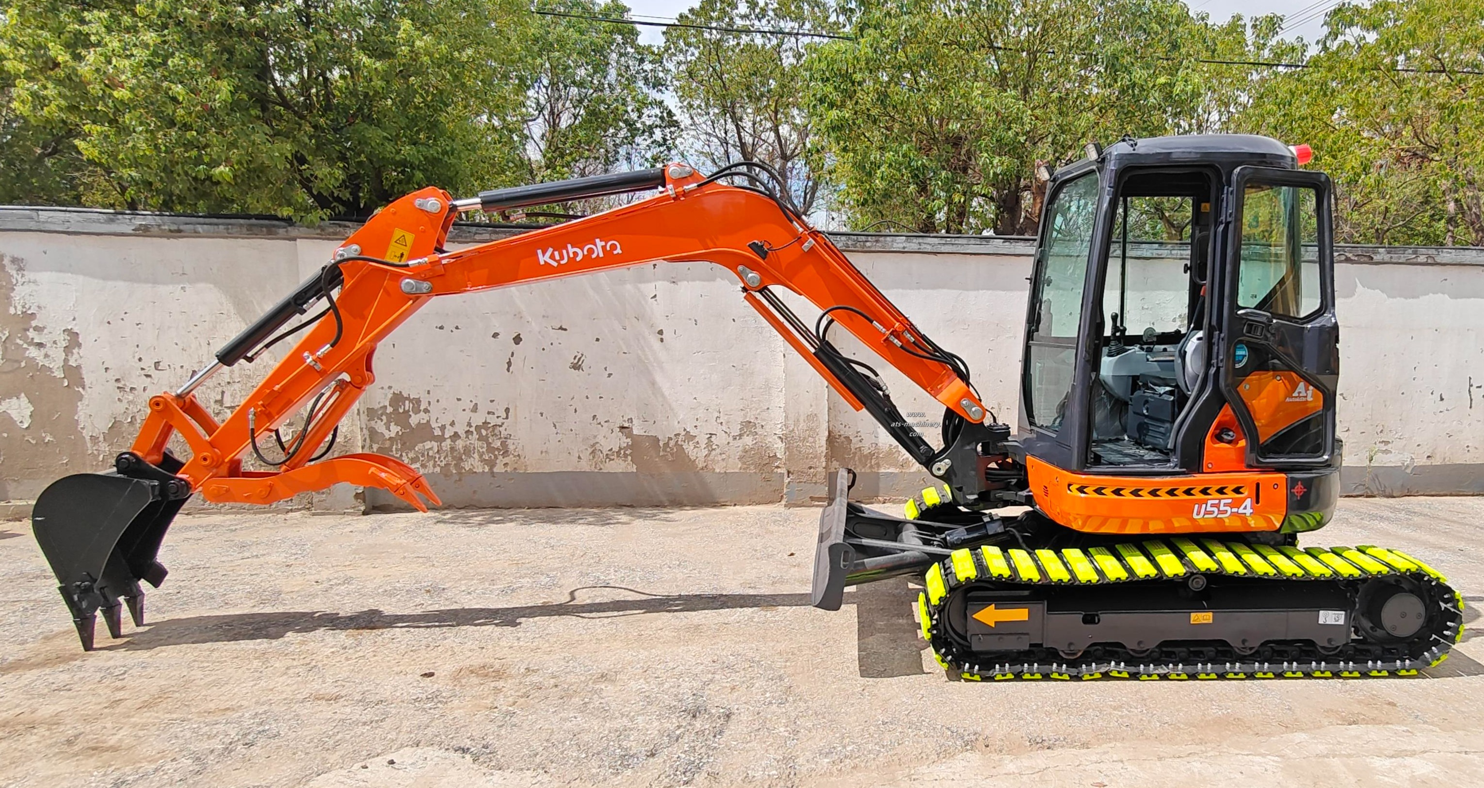 The KUBOTA U55-4 mini excavator features a boom swing for enhanced flexibility in tight spaces, a thumb clamp for handling various materials, and rubber blocks on its tracks to protect finished surfaces during operation. Used excavators are more cost-effective.