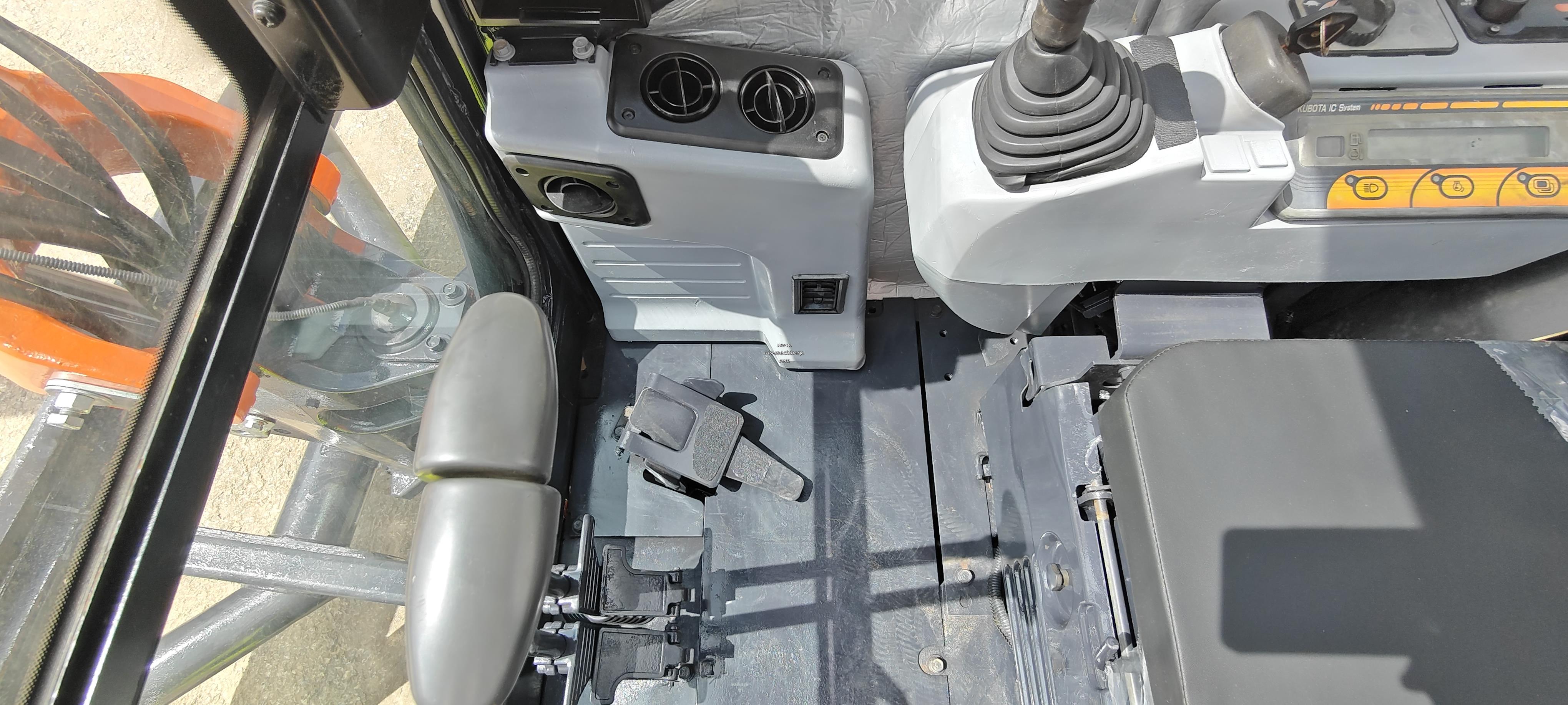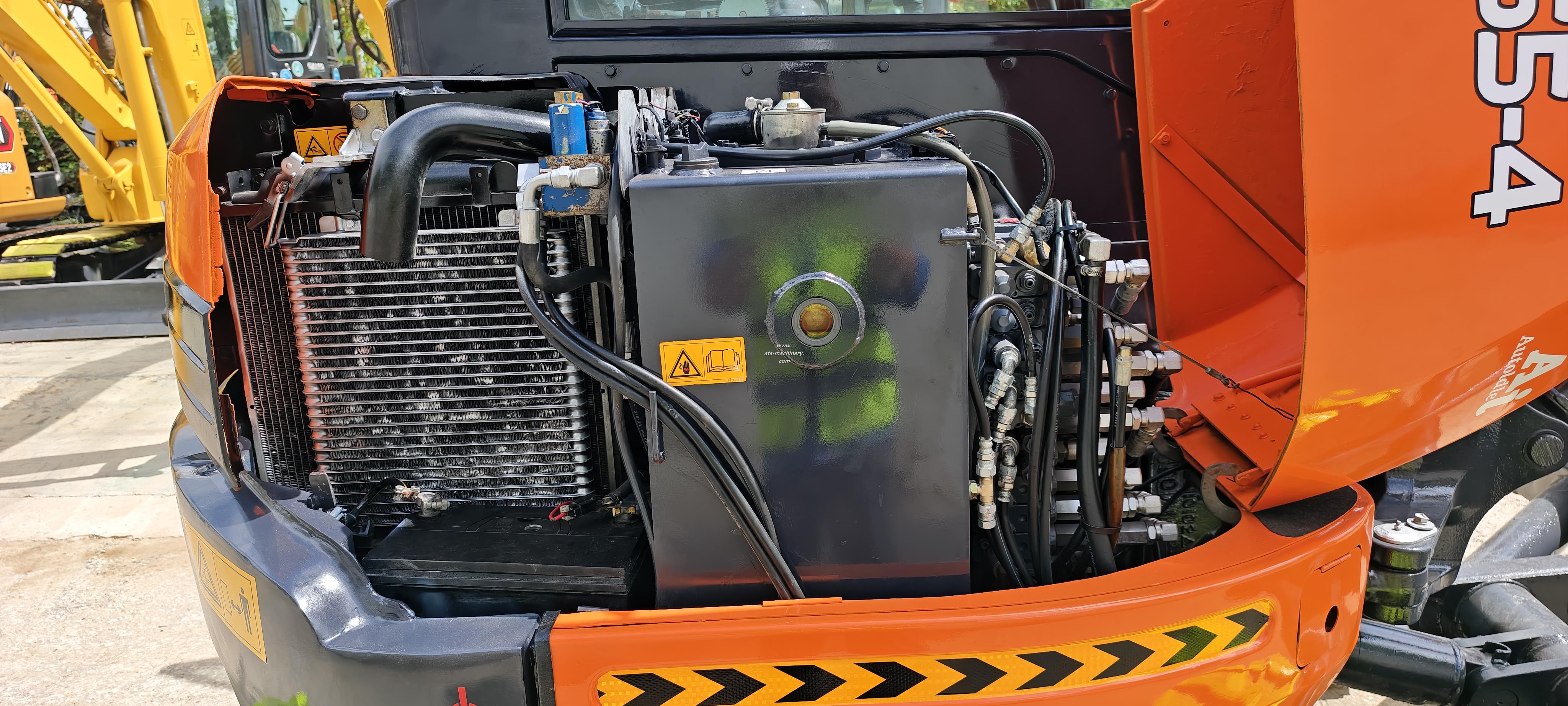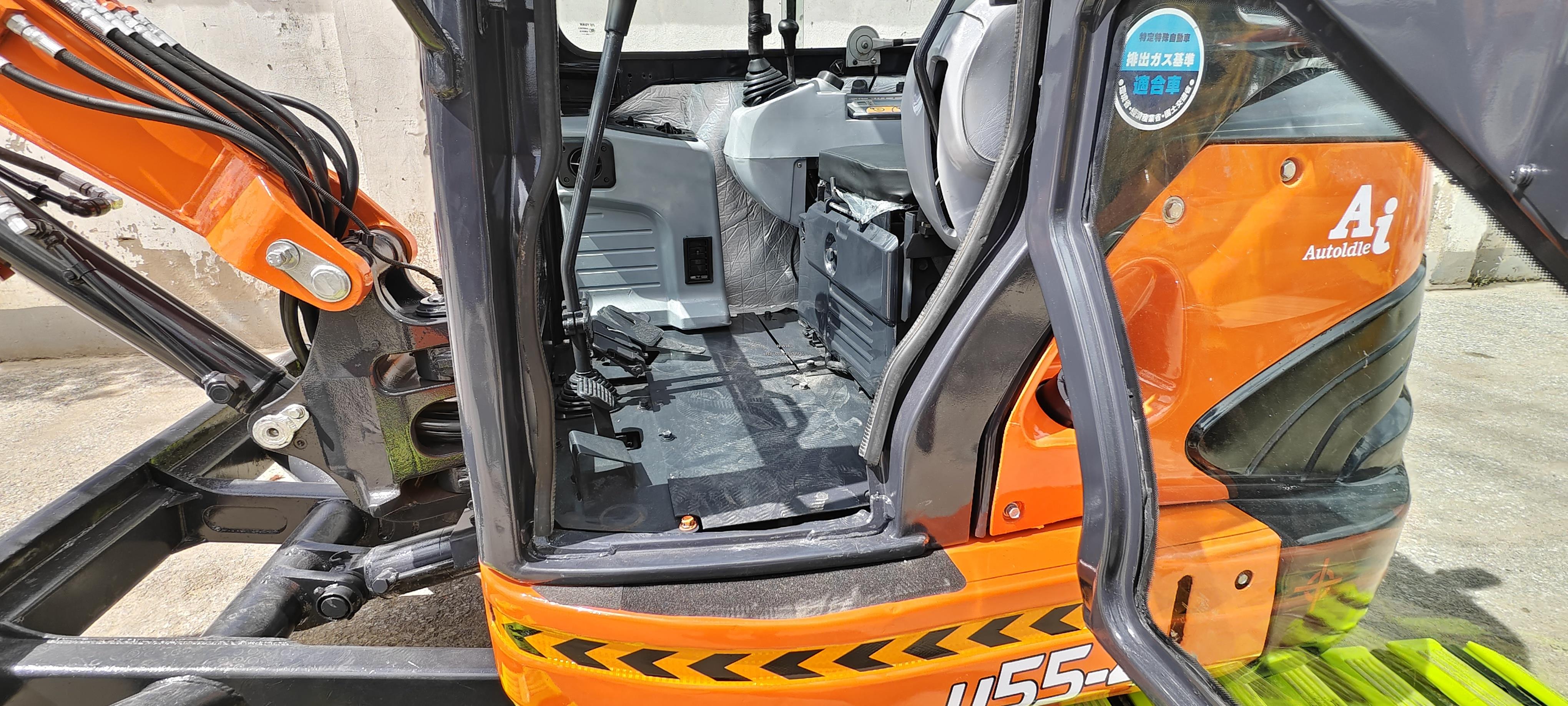 The KUBOTA U55-4 mini excavator features a boom swing for enhanced flexibility in tight spaces, a thumb clamp for handling various materials, and rubber blocks on its tracks to protect finished surfaces during operation. Used excavators are more cost-effective.