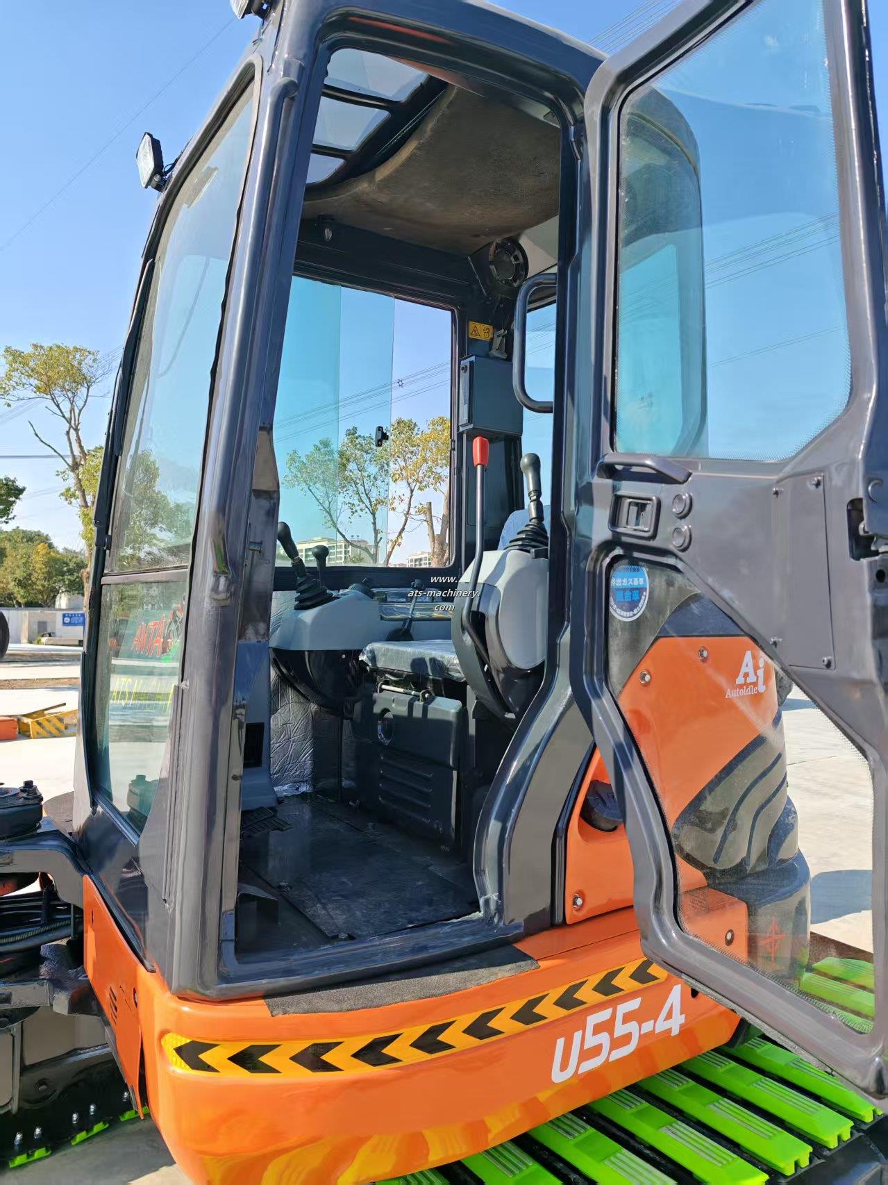The KUBOTA U55-4 mini excavator features a tailless design for 360-degree rotation in tight spaces. Its boom swing function allows for precise digging along obstacles, and the rubber blocks on its tracks ensure minimal ground damage during operation.