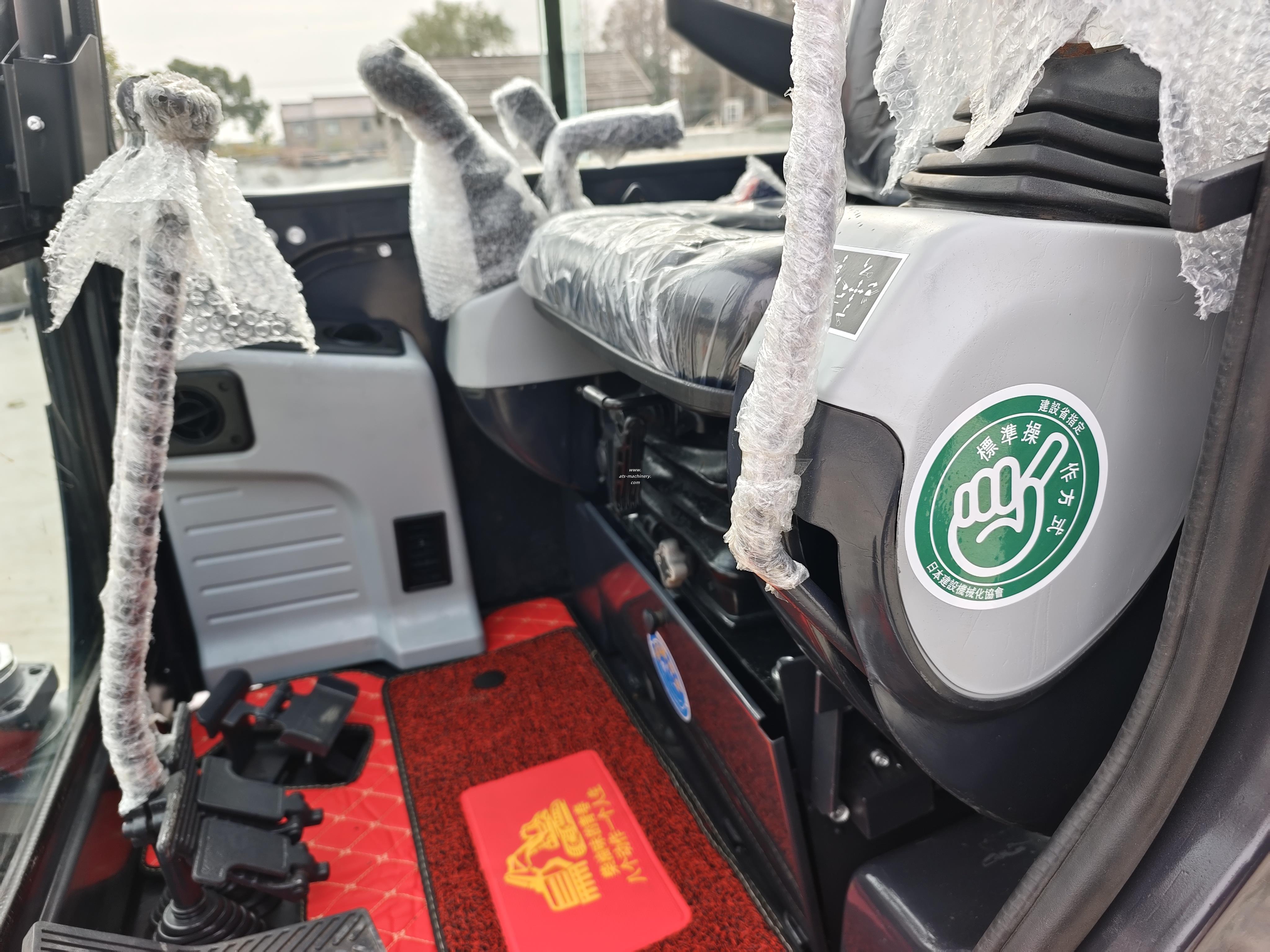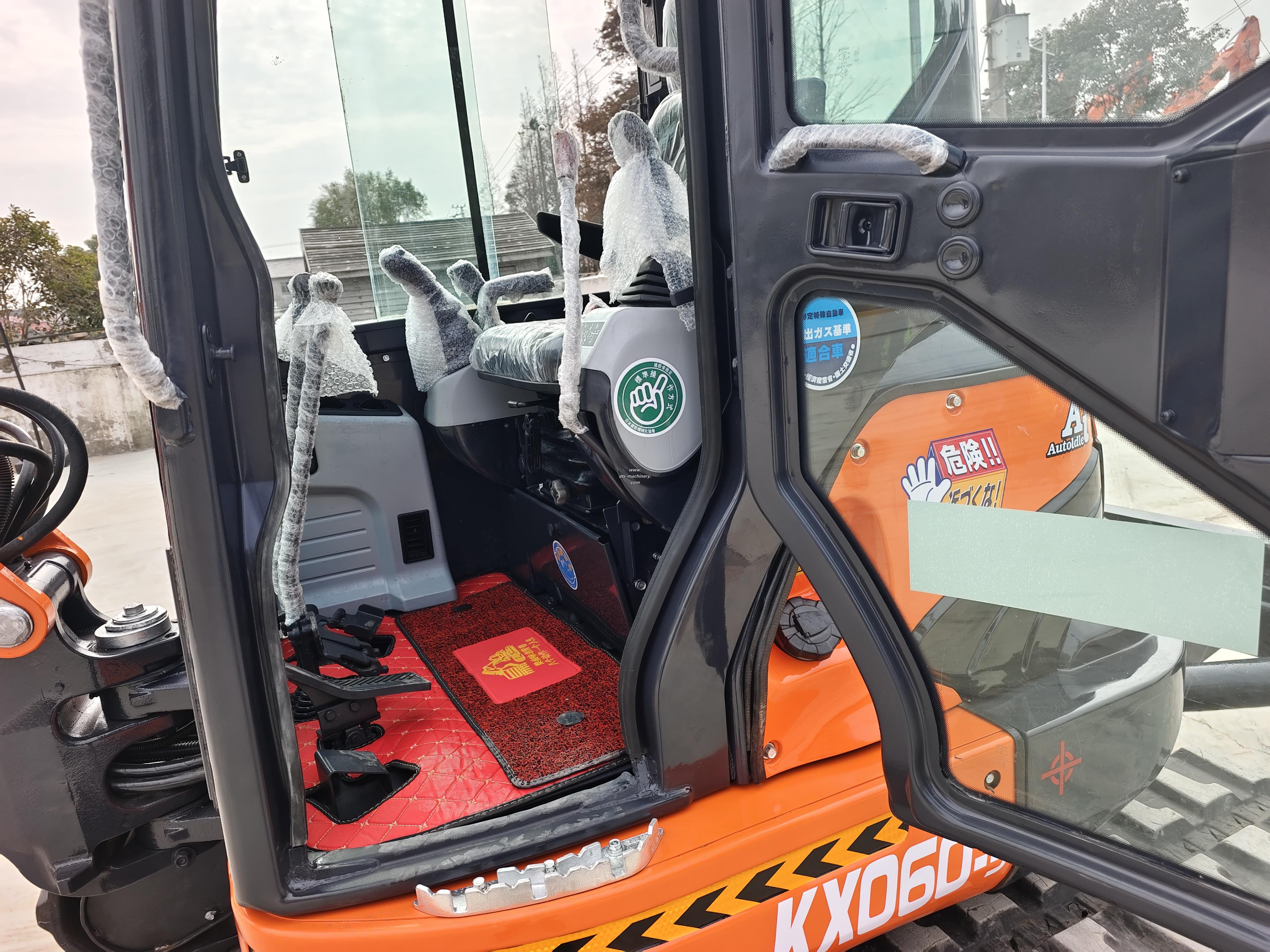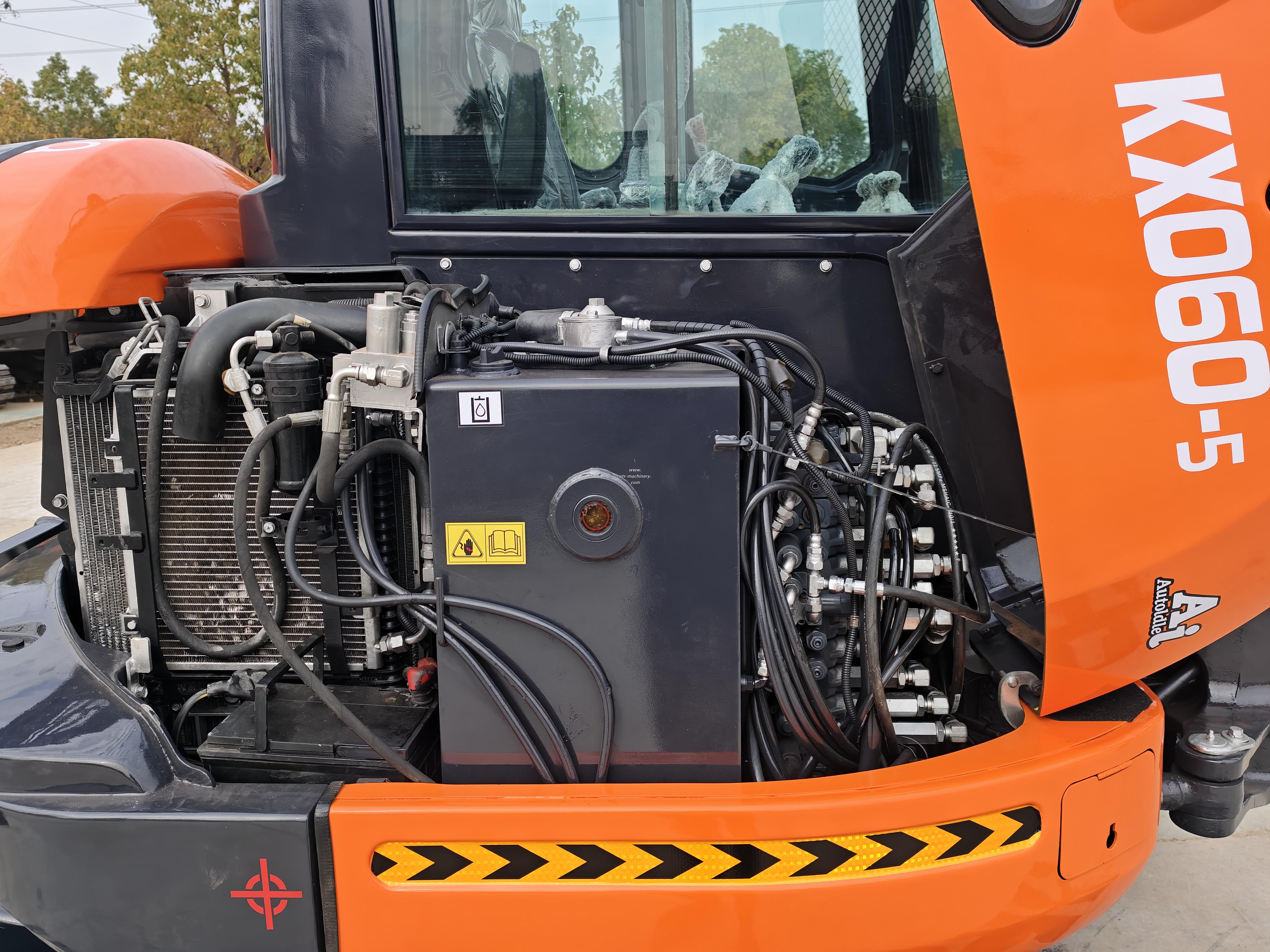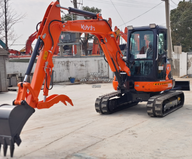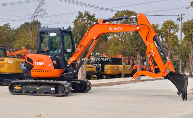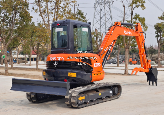 The KUBOTA 060-5 mini excavator features a tailless design for 360-degree rotation in tight spaces. Its boom swing function allows for precise digging along obstacles, and the rubber blocks on its tracks ensure minimal ground damage during operation.