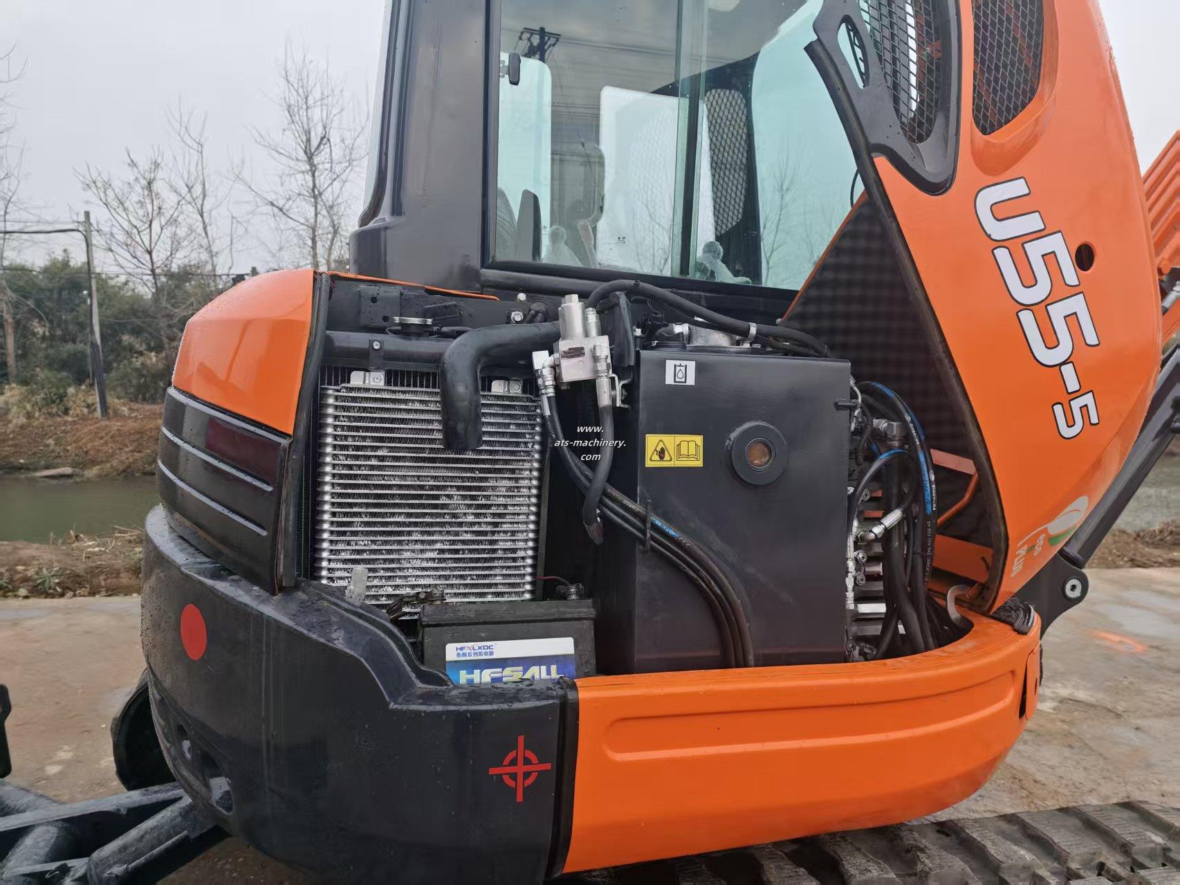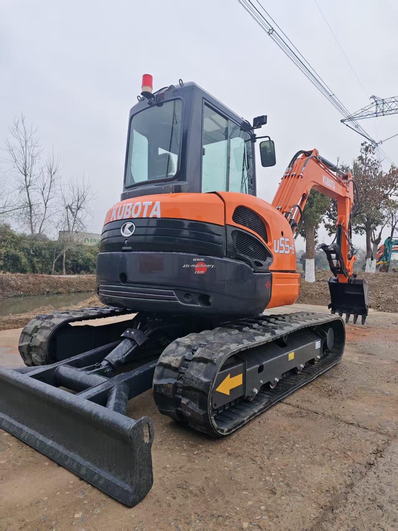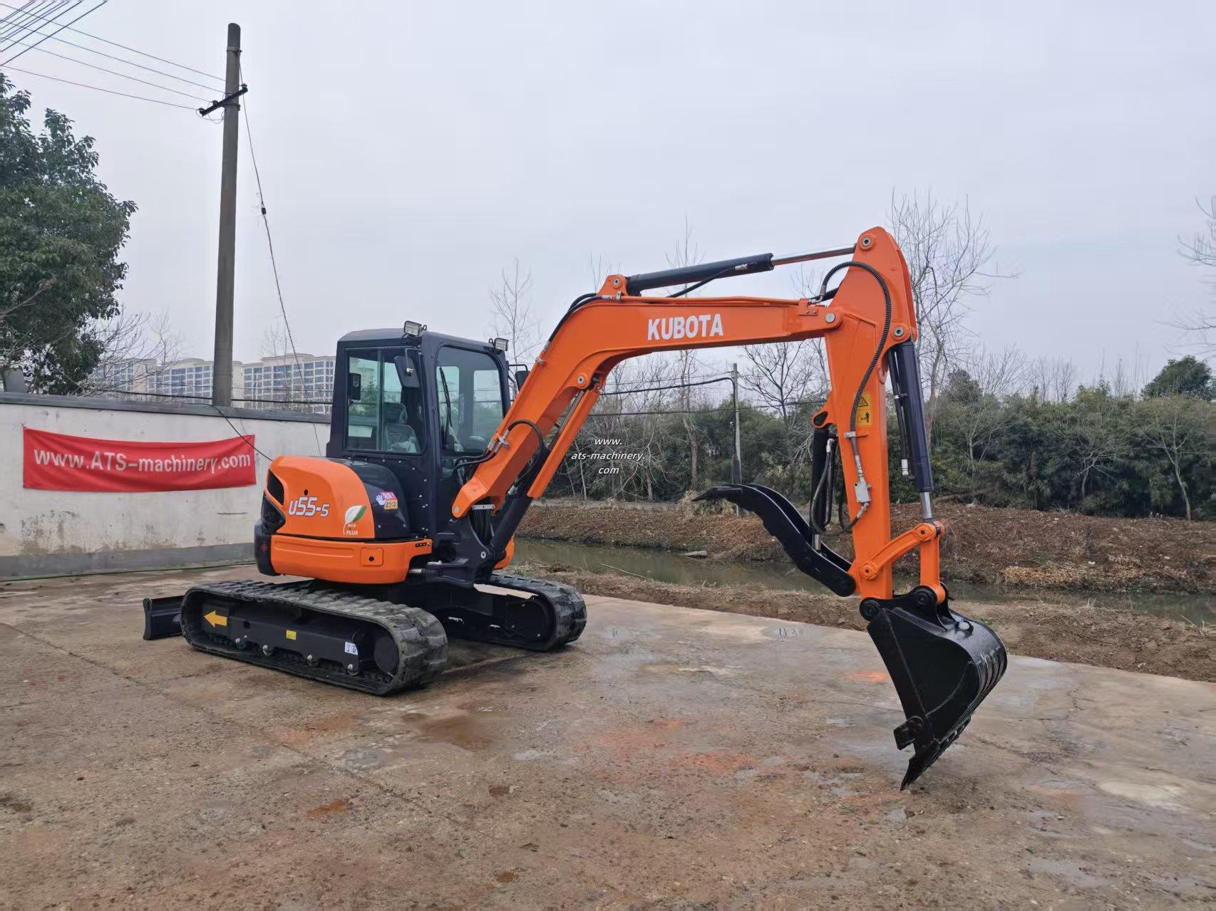 The KUBOTA U55-5 mini excavator features a tailless design for 360-degree rotation in tight spaces. Its boom swing function allows for precise digging along obstacles, and the rubber blocks on its tracks ensure minimal ground damage during operation.