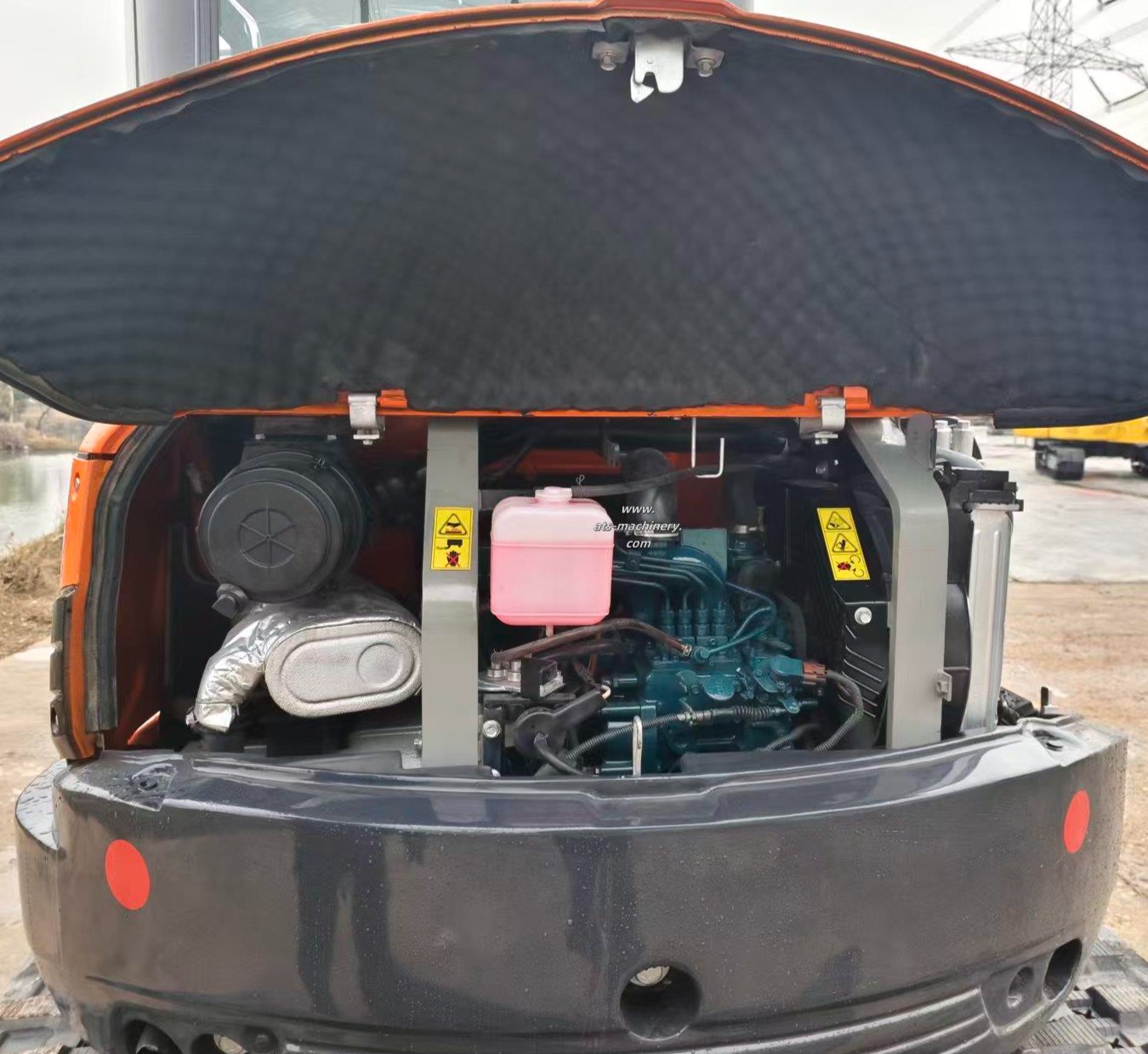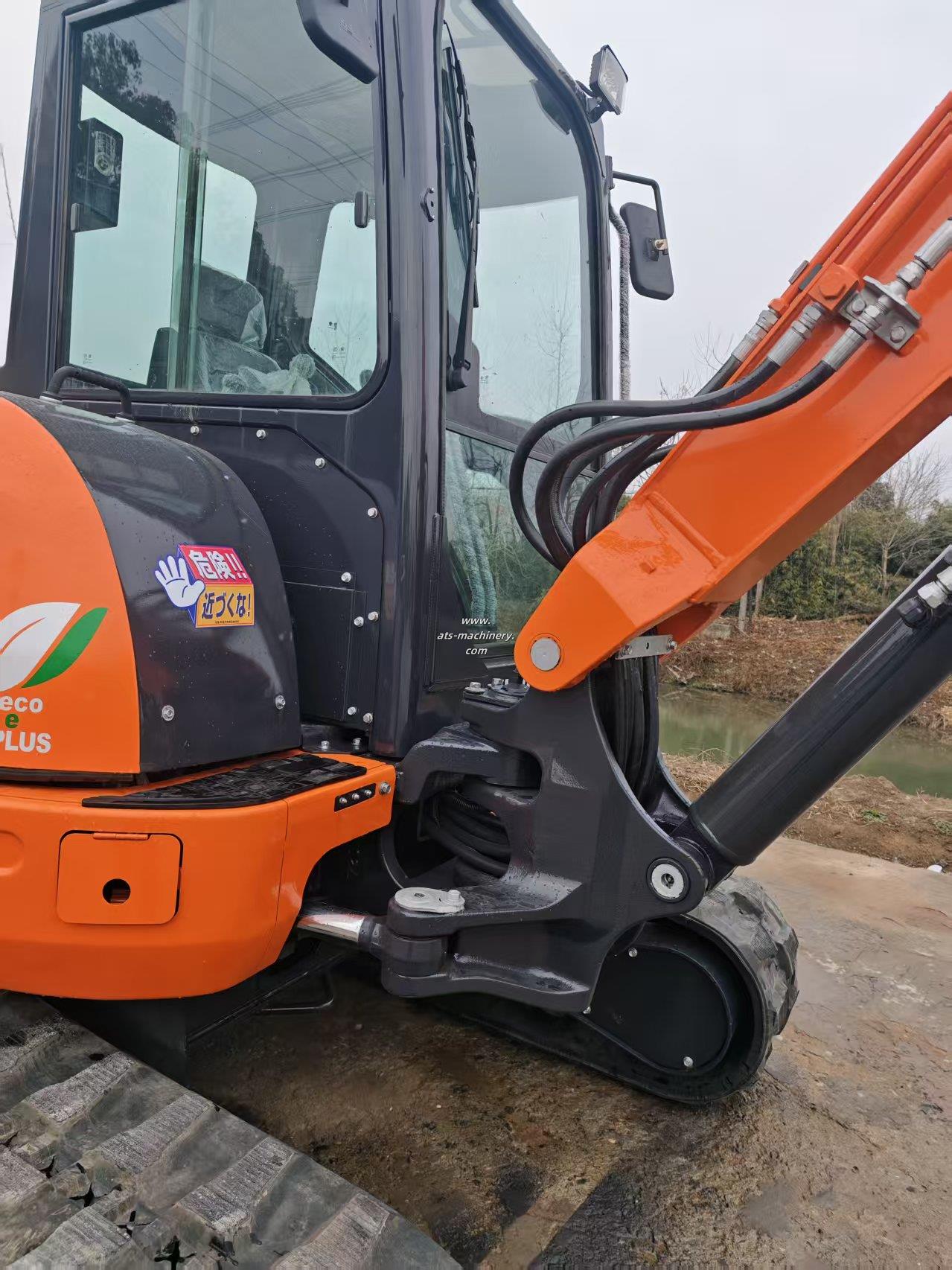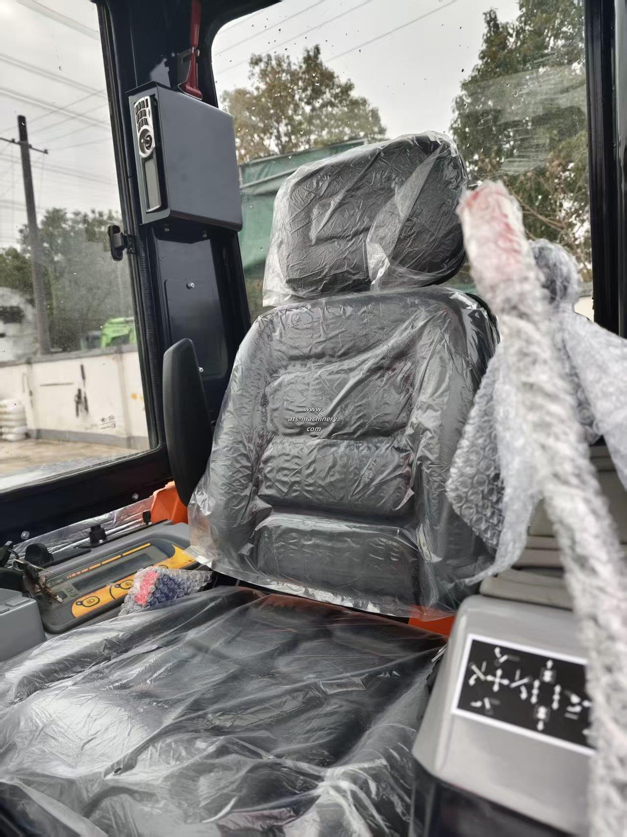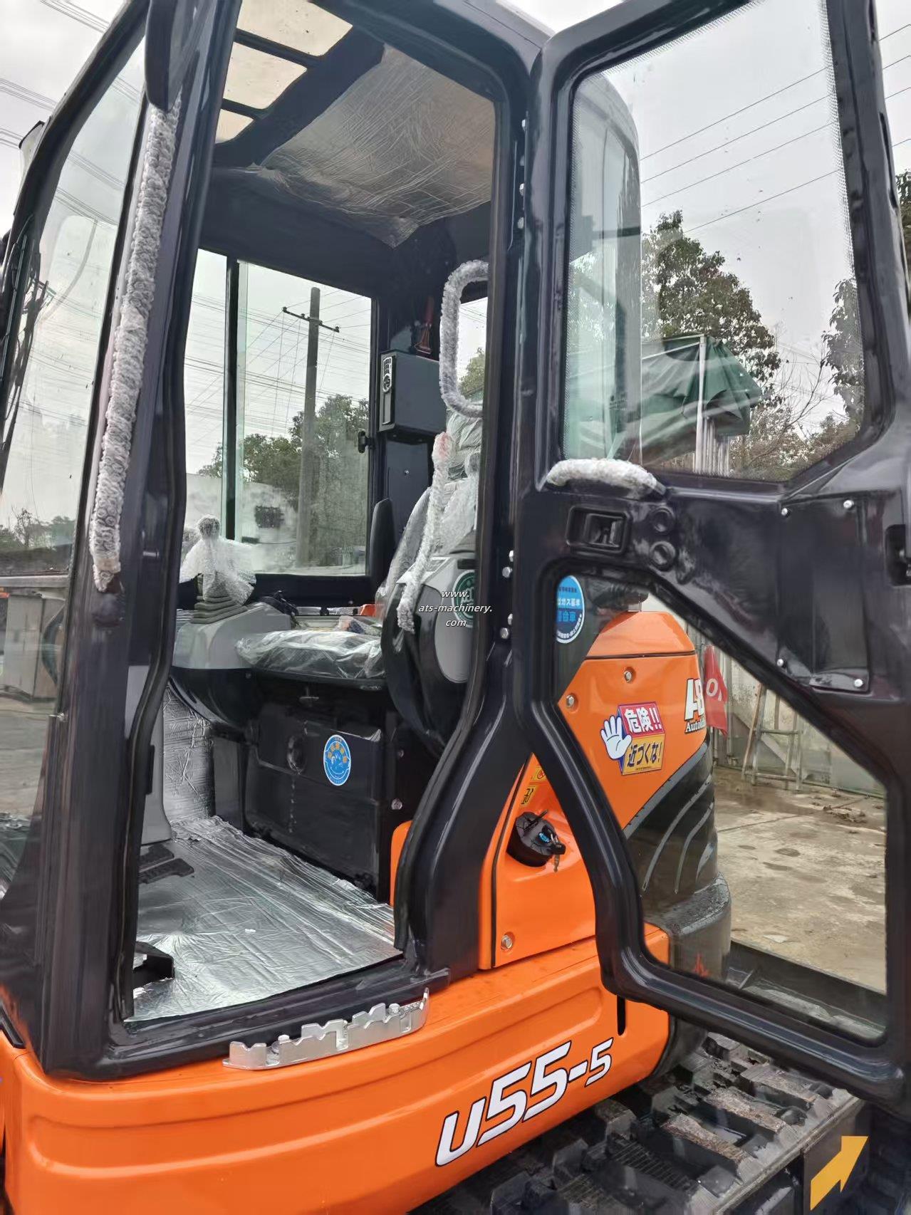 The KUBOTA U55-5 mini excavator features a tailless design for 360-degree rotation in tight spaces. Its boom swing function allows for precise digging along obstacles, and the rubber blocks on its tracks ensure minimal ground damage during operation.